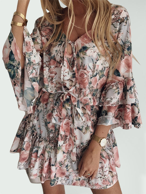 Look pretty in a petal-print ruffle-sleeve tiered ruffle mini dress.